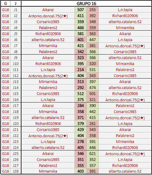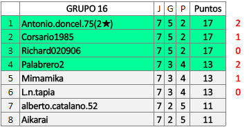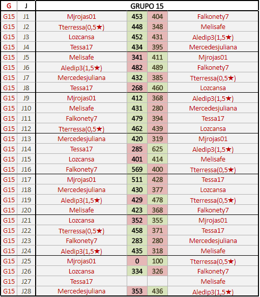 Deja un comentarioEn está página se irán publicando los resultados de las diferentes partidas, siendo ambos jugadores responsables de subirlos o de comprobar que ya hayan sido publicados insertando un COMENTARIO en la parte inferior de la pantalla (opción “Deja tu comentario”), indicando el nombre de los dos jugadores y los puntos obtenidos en la partida.