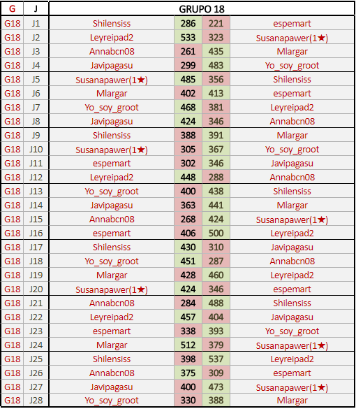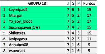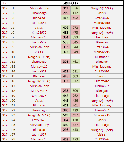 Deja un comentarioEn está página se irán publicando los resultados de las diferentes partidas, siendo ambos jugadores responsables de subirlos o de comprobar que ya hayan sido publicados insertando un COMENTARIO en la parte inferior de la pantalla (opción “Deja tu comentario”), indicando el nombre de los dos jugadores y los puntos obtenidos en la partida.