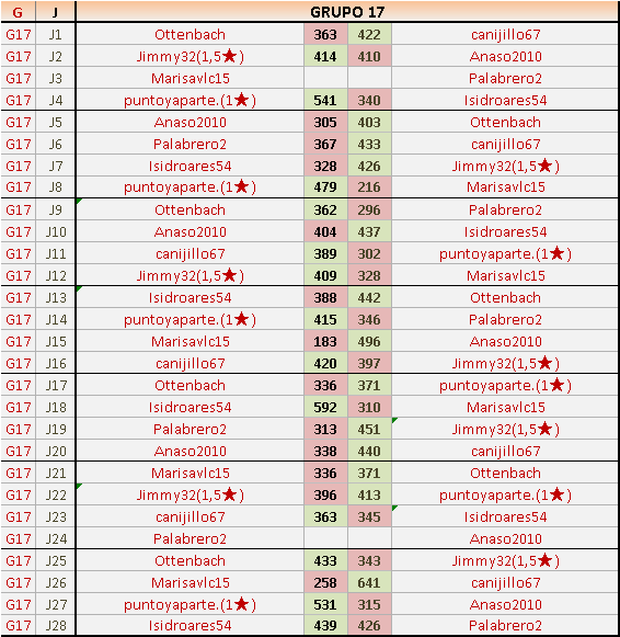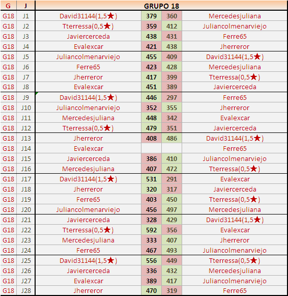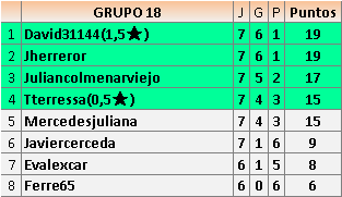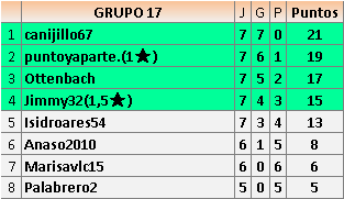 Deja un comentarioEn está página se irán publicando los resultados de las diferentes partidas, siendo ambos jugadores responsables de subirlos o de comprobar que ya hayan sido publicados insertando un COMENTARIO en la parte inferior de la pantalla (opción “Deja tu comentario”), indicando el nombre de los dos jugadores y los puntos obtenidos en la partida.