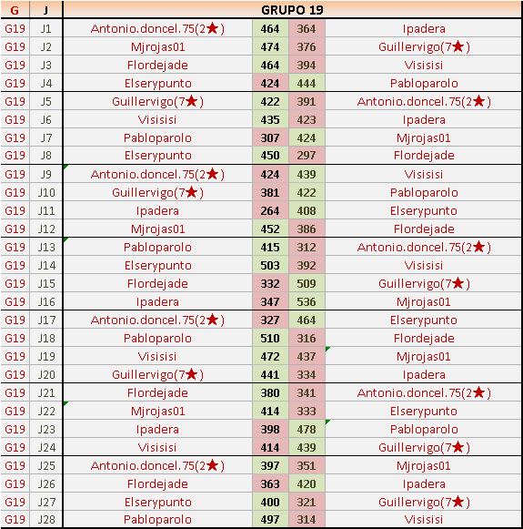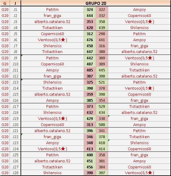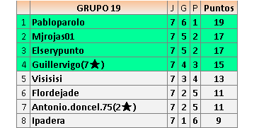 Deja un comentarioEn está página se irán publicando los resultados de las diferentes partidas, siendo ambos jugadores responsables de subirlos o de comprobar que ya hayan sido publicados insertando un COMENTARIO en la parte inferior de la pantalla (opción “Deja tu comentario”), indicando el nombre de los dos jugadores y los puntos obtenidos en la partida.