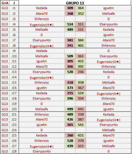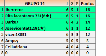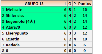 Deja un comentarioEn está página se irán publicando los resultados de las diferentes partidas, siendo ambos jugadores responsables de subirlos o de comprobar que ya hayan sido publicados insertando un COMENTARIO en la parte inferior de la pantalla (opción “Deja tu comentario”), indicando el nombre de los dos jugadores y los puntos obtenidos en la partida.