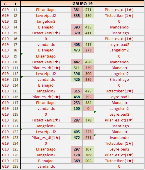 Deja un comentarioEn está página se irán publicando los resultados de las diferentes partidas, siendo ambos jugadores responsables de subirlos o de comprobar que ya hayan sido publicados insertando un COMENTARIO en la parte inferior de la pantalla (opción “Deja tu comentario”), indicando el nombre de los dos jugadores y los puntos obtenidos en la partida.
