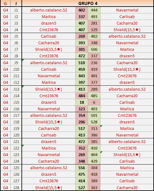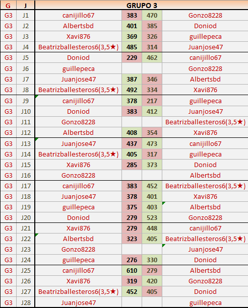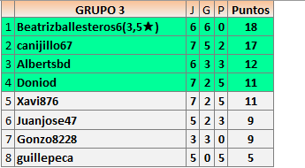 Deja un comentarioEn está página se irán publicando los resultados de las diferentes partidas, siendo ambos jugadores responsables de subirlos o de comprobar que ya hayan sido publicados insertando un COMENTARIO en la parte inferior de la pantalla (opción “Deja tu comentario”), indicando el nombre de los dos jugadores y los puntos obtenidos en la partida.