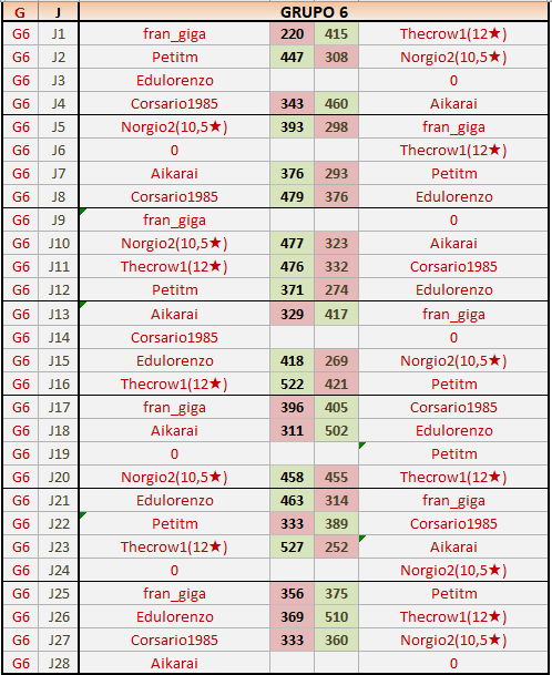 Deja un comentarioEn está página se irán publicando los resultados de las diferentes partidas, siendo ambos jugadores responsables de subirlos o de comprobar que ya hayan sido publicados insertando un COMENTARIO en la parte inferior de la pantalla (opción “Deja tu comentario”), indicando el nombre de los dos jugadores y los puntos obtenidos en la partida.