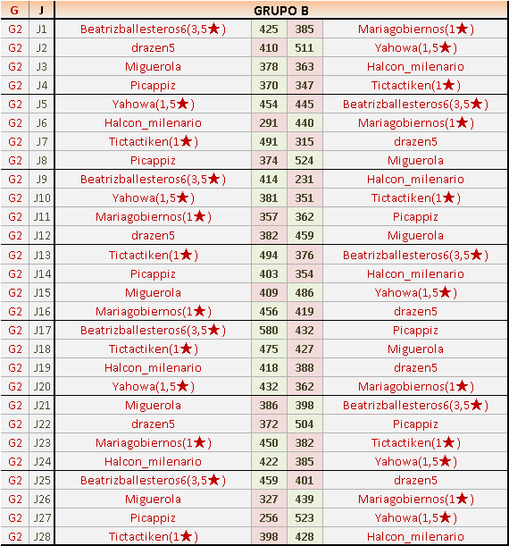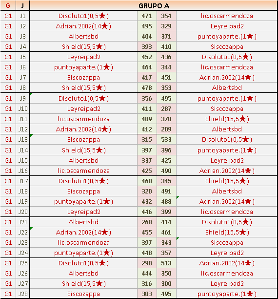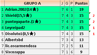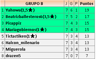 Deja un comentarioEn está página se irán publicando los resultados de las diferentes partidas, siendo ambos jugadores responsables de subirlos o de comprobar que ya hayan sido publicados insertando un COMENTARIO en la parte inferior de la pantalla (opción “Deja tu comentario”), indicando el nombre de los dos jugadores y los puntos obtenidos en la partida.