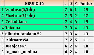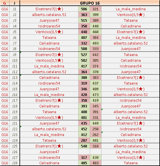 Deja un comentarioEn está página se irán publicando los resultados de las diferentes partidas, siendo ambos jugadores responsables de subirlos o de comprobar que ya hayan sido publicados insertando un COMENTARIO en la parte inferior de la pantalla (opción “Deja tu comentario”), indicando el nombre de los dos jugadores y los puntos obtenidos en la partida.
