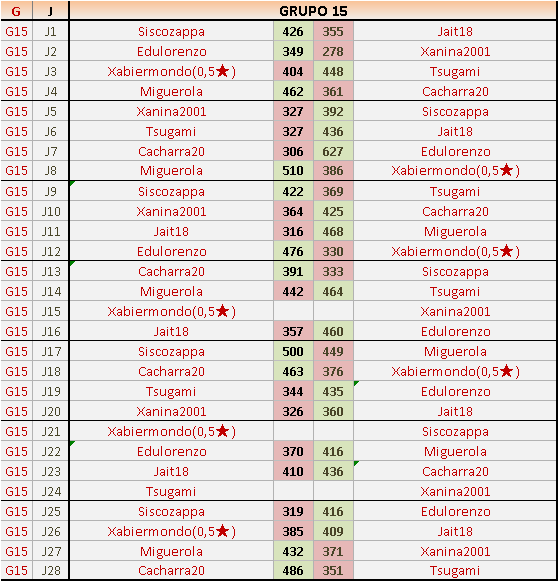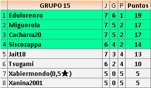 Deja un comentarioEn está página se irán publicando los resultados de las diferentes partidas, siendo ambos jugadores responsables de subirlos o de comprobar que ya hayan sido publicados insertando un COMENTARIO en la parte inferior de la pantalla (opción “Deja tu comentario”), indicando el nombre de los dos jugadores y los puntos obtenidos en la partida.