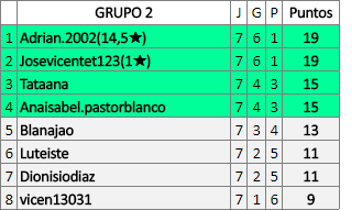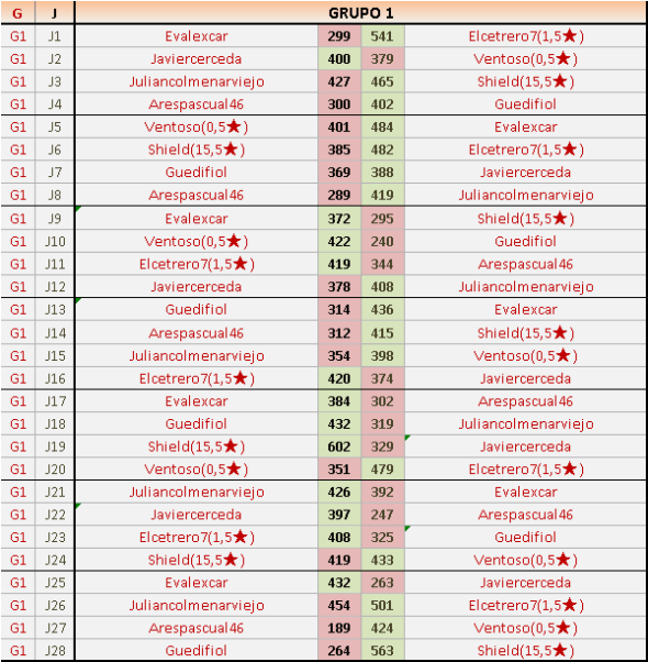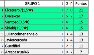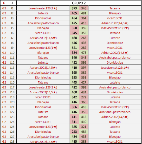 Deja un comentarioEn está página se irán publicando los resultados de las diferentes partidas, siendo ambos jugadores responsables de subirlos o de comprobar que ya hayan sido publicados insertando un COMENTARIO en la parte inferior de la pantalla (opción “Deja tu comentario”), indicando el nombre de los dos jugadores y los puntos obtenidos en la partida.