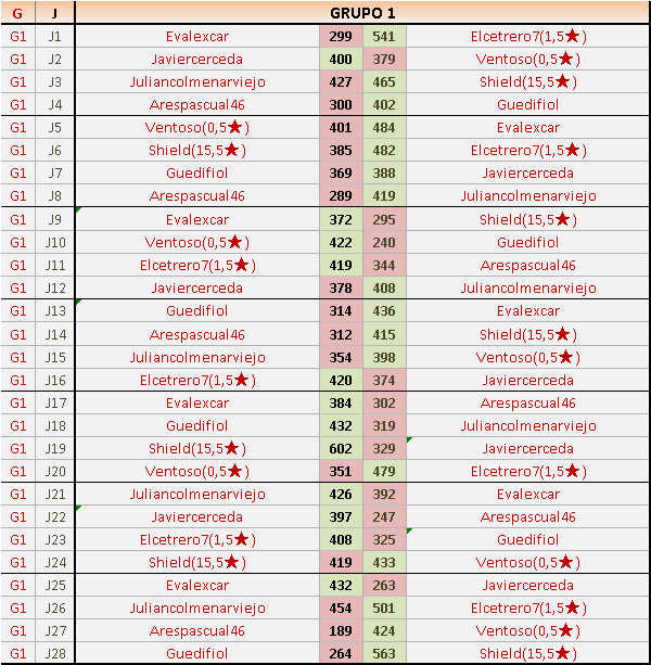 Deja un comentarioEn está página se irán publicando los resultados de las diferentes partidas, siendo ambos jugadores responsables de subirlos o de comprobar que ya hayan sido publicados insertando un COMENTARIO en la parte inferior de la pantalla (opción “Deja tu comentario”), indicando el nombre de los dos jugadores y los puntos obtenidos en la partida.
