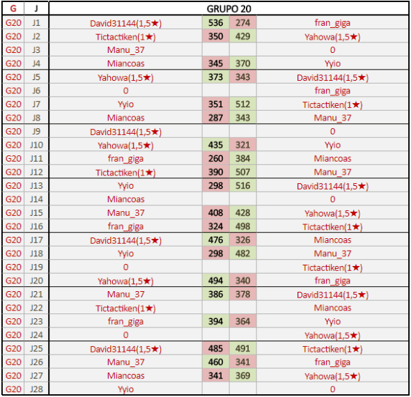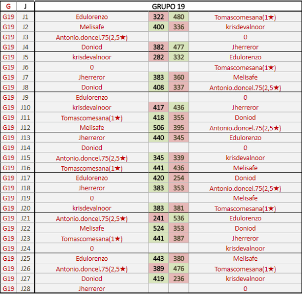 Deja un comentarioEn está página se irán publicando los resultados de las diferentes partidas, siendo ambos jugadores responsables de subirlos o de comprobar que ya hayan sido publicados insertando un COMENTARIO en la parte inferior de la pantalla (opción “Deja tu comentario”), indicando el nombre de los dos jugadores y los puntos obtenidos en la partida.
