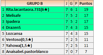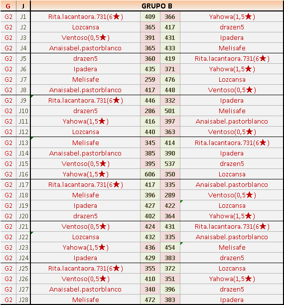Deja un comentarioEn está página se irán publicando los resultados de las diferentes partidas, siendo ambos jugadores responsables de subirlos o de comprobar que ya hayan sido publicados insertando un COMENTARIO en la parte inferior de la pantalla (opción “Deja tu comentario”), indicando el nombre de los dos jugadores y los puntos obtenidos en la partida.