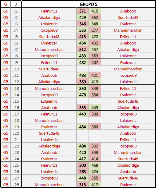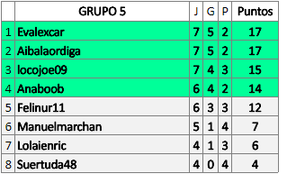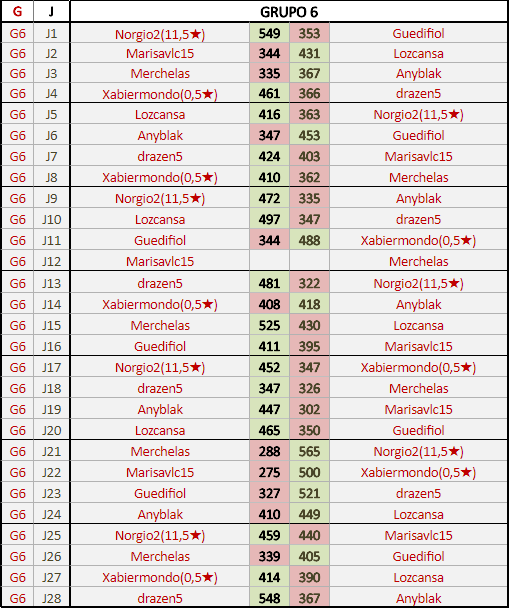 Deja un comentarioEn está página se irán publicando los resultados de las diferentes partidas, siendo ambos jugadores responsables de subirlos o de comprobar que ya hayan sido publicados insertando un COMENTARIO en la parte inferior de la pantalla (opción “Deja tu comentario”), indicando el nombre de los dos jugadores y los puntos obtenidos en la partida.