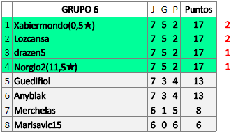 Deja un comentarioEn está página se irán publicando los resultados de las diferentes partidas, siendo ambos jugadores responsables de subirlos o de comprobar que ya hayan sido publicados insertando un COMENTARIO en la parte inferior de la pantalla (opción “Deja tu comentario”), indicando el nombre de los dos jugadores y los puntos obtenidos en la partida.