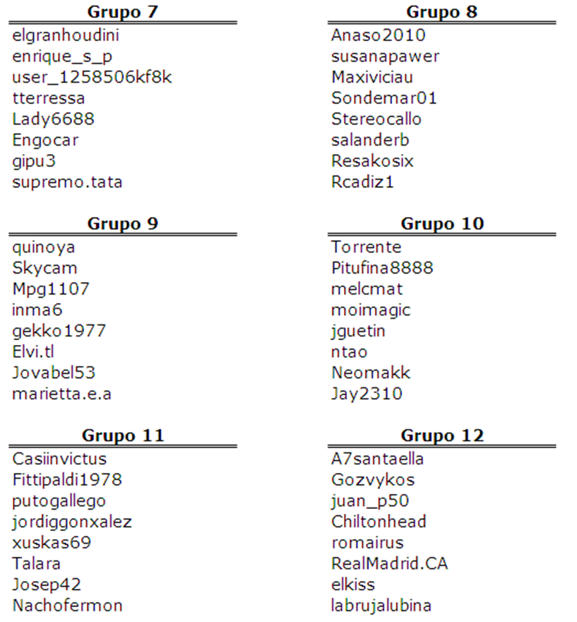 A continuación tenéis todos los grupos y los jugadores que los forman: