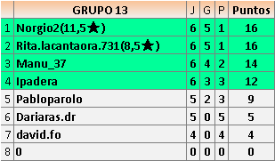 1En está página se irán publicando los resultados de las diferentes partidas, siendo ambos jugadores responsables de subirlos o de comprobar que ya hayan sido publicados insertando un COMENTARIO en la parte inferior de la pantalla (opción “Deja tu comentario”), indicando el nombre de los dos jugadores y los puntos obtenidos en la partida.