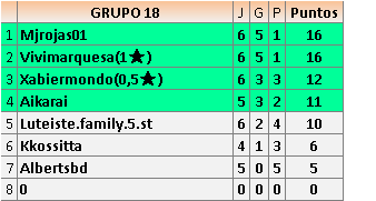 Deja un comentarioEn está página se irán publicando los resultados de las diferentes partidas, siendo ambos jugadores responsables de subirlos o de comprobar que ya hayan sido publicados insertando un COMENTARIO en la parte inferior de la pantalla (opción “Deja tu comentario”), indicando el nombre de los dos jugadores y los puntos obtenidos en la partida.