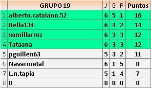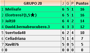 Deja un comentarioEn está página se irán publicando los resultados de las diferentes partidas, siendo ambos jugadores responsables de subirlos o de comprobar que ya hayan sido publicados insertando un COMENTARIO en la parte inferior de la pantalla (opción “Deja tu comentario”), indicando el nombre de los dos jugadores y los puntos obtenidos en la partida.