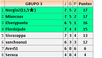 Deja un comentarioEn está página se irán publicando los resultados de las diferentes partidas, siendo ambos jugadores responsables de subirlos o de comprobar que ya hayan sido publicados insertando un COMENTARIO en la parte inferior de la pantalla (opción “Deja tu comentario”), indicando el nombre de los dos jugadores y los puntos obtenidos en la partida.