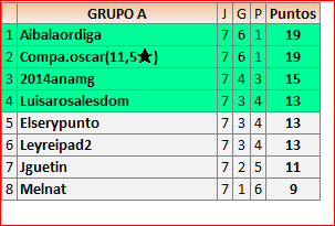 Aunque creo que no influye en la clasificación final, por favor, revisad mi último mensaje con las puntuaciones, y corregid mi resultado en Grupo A, J.13, con Melnat, ya que finalmente gané yo la partida.