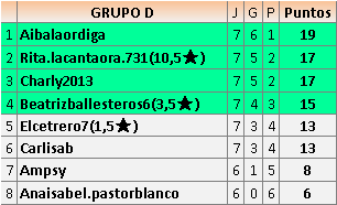 1En está página se irán publicando los resultados de las diferentes partidas, siendo ambos jugadores responsables de subirlos o de comprobar que ya hayan sido publicados insertando un COMENTARIO en la parte inferior de la pantalla (opción “Deja tu comentario”), indicando el nombre de los dos jugadores y los puntos obtenidos en la partida.