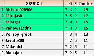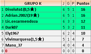 Deja un comentarioEn está página se irán publicando los resultados de las diferentes partidas, siendo ambos jugadores responsables de subirlos o de comprobar que ya hayan sido publicados insertando un COMENTARIO en la parte inferior de la pantalla (opción “Deja tu comentario”), indicando el nombre de los dos jugadores y los puntos obtenidos en la partida.