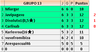 Deja un comentarioEn está página se irán publicando los resultados de las diferentes partidas, siendo ambos jugadores responsables de subirlos o de comprobar que ya hayan sido publicados insertando un COMENTARIO en la parte inferior de la pantalla (opción “Deja tu comentario”), indicando el nombre de los dos jugadores y los puntos obtenidos en la partida.