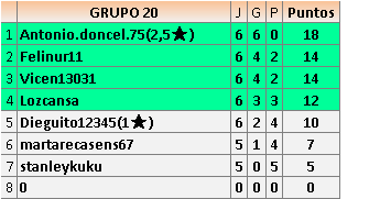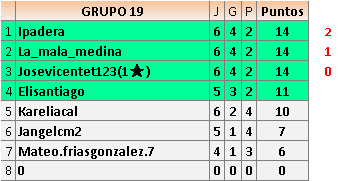 Deja un comentarioEn está página se irán publicando los resultados de las diferentes partidas, siendo ambos jugadores responsables de subirlos o de comprobar que ya hayan sido publicados insertando un COMENTARIO en la parte inferior de la pantalla (opción “Deja tu comentario”), indicando el nombre de los dos jugadores y los puntos obtenidos en la partida.