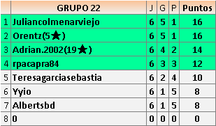 Deja un comentarioEn está página se irán publicando los resultados de las diferentes partidas, siendo ambos jugadores responsables de subirlos o de comprobar que ya hayan sido publicados insertando un COMENTARIO en la parte inferior de la pantalla (opción “Deja tu comentario”), indicando el nombre de los dos jugadores y los puntos obtenidos en la partida.