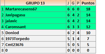 Deja un comentarioEn está página se irán publicando los resultados de las diferentes partidas, siendo ambos jugadores responsables de subirlos o de comprobar que ya hayan sido publicados insertando un COMENTARIO en la parte inferior de la pantalla (opción “Deja tu comentario”), indicando el nombre de los dos jugadores y los puntos obtenidos en la partida.