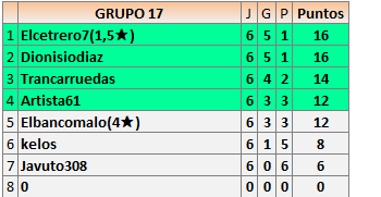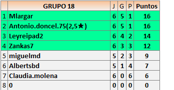 Deja un comentarioEn está página se irán publicando los resultados de las diferentes partidas, siendo ambos jugadores responsables de subirlos o de comprobar que ya hayan sido publicados insertando un COMENTARIO en la parte inferior de la pantalla (opción “Deja tu comentario”), indicando el nombre de los dos jugadores y los puntos obtenidos en la partida.