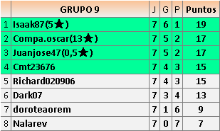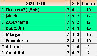 Deja un comentarioEn está página se irán publicando los resultados de las diferentes partidas, siendo ambos jugadores responsables de subirlos o de comprobar que ya hayan sido publicados insertando un COMENTARIO en la parte inferior de la pantalla (opción “Deja tu comentario”), indicando el nombre de los dos jugadores y los puntos obtenidos en la partida.
