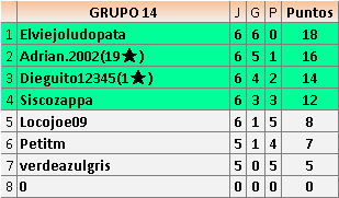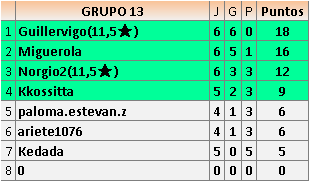 Deja un comentarioEn está página se irán publicando los resultados de las diferentes partidas, siendo ambos jugadores responsables de subirlos o de comprobar que ya hayan sido publicados insertando un COMENTARIO en la parte inferior de la pantalla (opción “Deja tu comentario”), indicando el nombre de los dos jugadores y los puntos obtenidos en la partida.