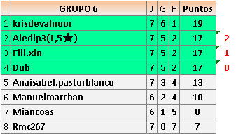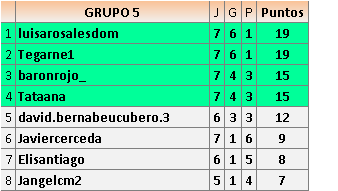 Deja un comentarioEn está página se irán publicando los resultados de las diferentes partidas, siendo ambos jugadores responsables de subirlos o de comprobar que ya hayan sido publicados insertando un COMENTARIO en la parte inferior de la pantalla (opción “Deja tu comentario”), indicando el nombre de los dos jugadores y los puntos obtenidos en la partida.