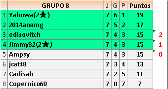 No quiero que cambieis ya la clasificación ,ni aún en el caso de tener yo razón , no se trata de eso , pero no entiendo muy bien la laxitud en cuanto a la norma de la obligatoriedad de publicación de resultados . La partida épsilon -miguelmd no fue publicada por ninguno de los dos jugadores dentro del plazo , fue publicada por épsilon a las doce de la noche ( la única q publicó ) ya fuera de plazo . A todo el mundo nos da pereza publicar los resultados pero si es una norma es una norma , los concursos pierden toda o interés si no se cumplen a rajatabla. Esa partida según el reglamento debería condiderarse no jugada y épsilon tendría 12 puntos . Reitero q no reclamo que me incluyan a mí en la fase 2 , de hecho lo rechazo si se me propusiera , simplemente pido seriedad , de él buen funcionamiento del juego nos beneficiamos todos .