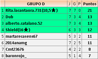Deja un comentarioEn está página se irán publicando los resultados de las diferentes partidas, siendo ambos jugadores responsables de subirlos o de comprobar que ya hayan sido publicados insertando un COMENTARIO en la parte inferior de la pantalla (opción “Deja tu comentario”), indicando el nombre de los dos jugadores y los puntos obtenidos en la partida.