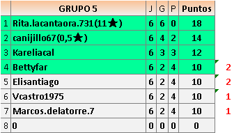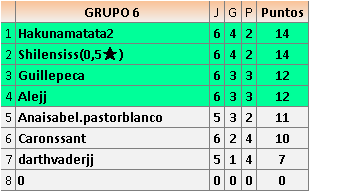Deja un comentarioEn está página se irán publicando los resultados de las diferentes partidas, siendo ambos jugadores responsables de subirlos o de comprobar que ya hayan sido publicados insertando un COMENTARIO en la parte inferior de la pantalla (opción “Deja tu comentario”), indicando el nombre de los dos jugadores y los puntos obtenidos en la partida.