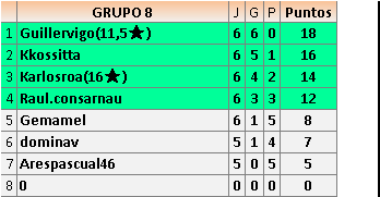 Deja un comentarioEn está página se irán publicando los resultados de las diferentes partidas, siendo ambos jugadores responsables de subirlos o de comprobar que ya hayan sido publicados insertando un COMENTARIO en la parte inferior de la pantalla (opción “Deja tu comentario”), indicando el nombre de los dos jugadores y los puntos obtenidos en la partida.