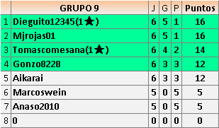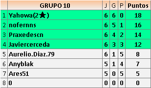 Deja un comentarioEn está página se irán publicando los resultados de las diferentes partidas, siendo ambos jugadores responsables de subirlos o de comprobar que ya hayan sido publicados insertando un COMENTARIO en la parte inferior de la pantalla (opción “Deja tu comentario”), indicando el nombre de los dos jugadores y los puntos obtenidos en la partida.