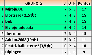 Deja un comentarioEn está página se irán publicando los resultados de las diferentes partidas, siendo ambos jugadores responsables de subirlos o de comprobar que ya hayan sido publicados insertando un COMENTARIO en la parte inferior de la pantalla (opción “Deja tu comentario”), indicando el nombre de los dos jugadores y los puntos obtenidos en la partida.