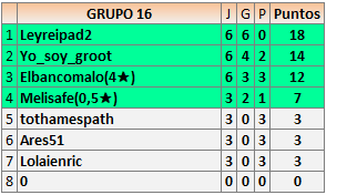 Deja un comentarioEn está página se irán publicando los resultados de las diferentes partidas, siendo ambos jugadores responsables de subirlos o de comprobar que ya hayan sido publicados insertando un COMENTARIO en la parte inferior de la pantalla (opción “Deja tu comentario”), indicando el nombre de los dos jugadores y los puntos obtenidos en la partida.