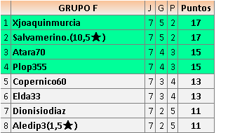 Deja un comentarioEn está página se irán publicando los resultados de las diferentes partidas, siendo ambos jugadores responsables de subirlos o de comprobar que ya hayan sido publicados insertando un COMENTARIO en la parte inferior de la pantalla (opción “Deja tu comentario”), indicando el nombre de los dos jugadores y los puntos obtenidos en la partida.
