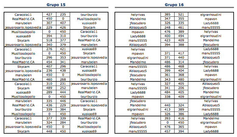 En está página se irán indicando los resultados de las diferentes partidas. Lo único que tienes que hacer es insertar un comentario en la parte inferior de la pantalla (“Deja tu comentario”) indicando el nombre de los dos usuarios y los puntos obtenidos por ambos en la partida. El vencedor de cada partida será el encargado de comunicar el resultado en este apartado.