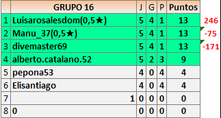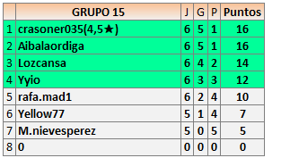 Deja un comentarioEn está página se irán publicando los resultados de las diferentes partidas, siendo ambos jugadores responsables de subirlos o de comprobar que ya hayan sido publicados insertando un COMENTARIO en la parte inferior de la pantalla (opción “Deja tu comentario”), indicando el nombre de los dos jugadores y los puntos obtenidos en la partida.