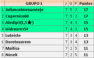 Deja un comentarioEn está página se irán publicando los resultados de las diferentes partidas, siendo ambos jugadores responsables de subirlos o de comprobar que ya hayan sido publicados insertando un COMENTARIO en la parte inferior de la pantalla (opción “Deja tu comentario”), indicando el nombre de los dos jugadores y los puntos obtenidos en la partida.
