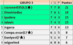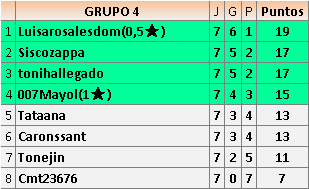Deja un comentarioEn está página se irán publicando los resultados de las diferentes partidas, siendo ambos jugadores responsables de subirlos o de comprobar que ya hayan sido publicados insertando un COMENTARIO en la parte inferior de la pantalla (opción “Deja tu comentario”), indicando el nombre de los dos jugadores y los puntos obtenidos en la partida.