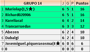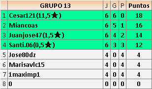 Deja un comentarioEn está página se irán publicando los resultados de las diferentes partidas, siendo ambos jugadores responsables de subirlos o de comprobar que ya hayan sido publicados insertando un COMENTARIO en la parte inferior de la pantalla (opción “Deja tu comentario”), indicando el nombre de los dos jugadores y los puntos obtenidos en la partida.