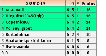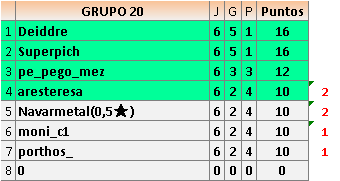 Deja un comentarioEn está página se irán publicando los resultados de las diferentes partidas, siendo ambos jugadores responsables de subirlos o de comprobar que ya hayan sido publicados insertando un COMENTARIO en la parte inferior de la pantalla (opción “Deja tu comentario”), indicando el nombre de los dos jugadores y los puntos obtenidos en la partida.