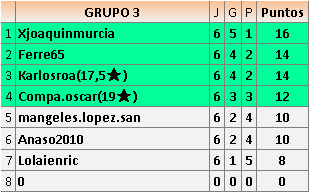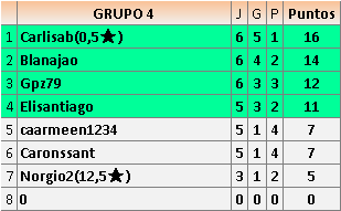 Deja un comentarioEn está página se irán publicando los resultados de las diferentes partidas, siendo ambos jugadores responsables de subirlos o de comprobar que ya hayan sido publicados insertando un COMENTARIO en la parte inferior de la pantalla (opción “Deja tu comentario”), indicando el nombre de los dos jugadores y los puntos obtenidos en la partida.