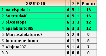 Deja un comentarioEn está página se irán publicando los resultados de las diferentes partidas, siendo ambos jugadores responsables de subirlos o de comprobar que ya hayan sido publicados insertando un COMENTARIO en la parte inferior de la pantalla (opción “Deja tu comentario”), indicando el nombre de los dos jugadores y los puntos obtenidos en la partida.