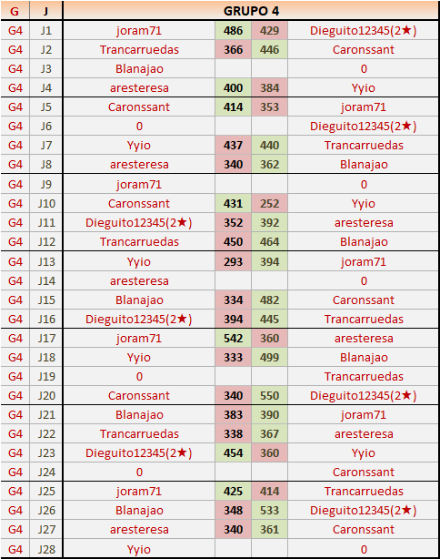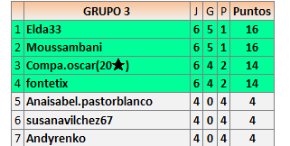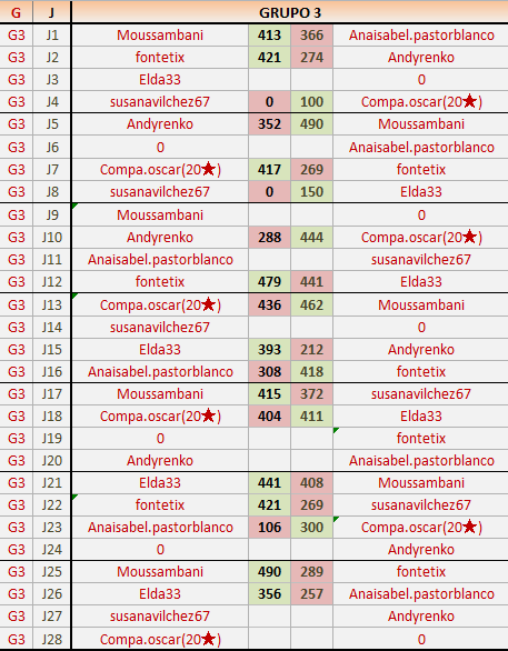Deja un comentarioEn está página se irán publicando los resultados de las diferentes partidas, siendo ambos jugadores responsables de subirlos o de comprobar que ya hayan sido publicados insertando un COMENTARIO en la parte inferior de la pantalla (opción “Deja tu comentario”), indicando el nombre de los dos jugadores y los puntos obtenidos en la partida.